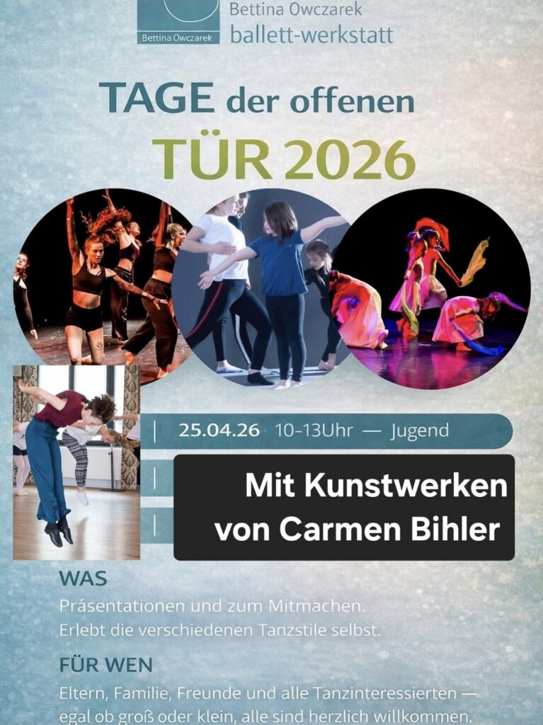 Tag der Offenen Tür in der Ballett-Werkstatt Owczarek in Ravensburg am 25.04.2026 mit Kunstwerken von mir